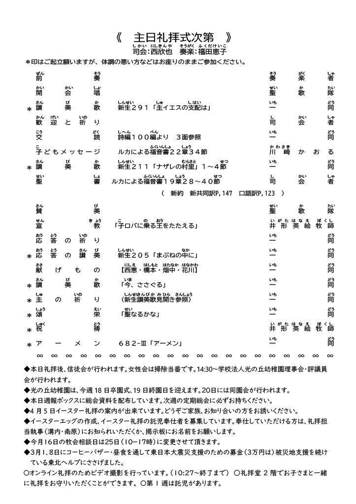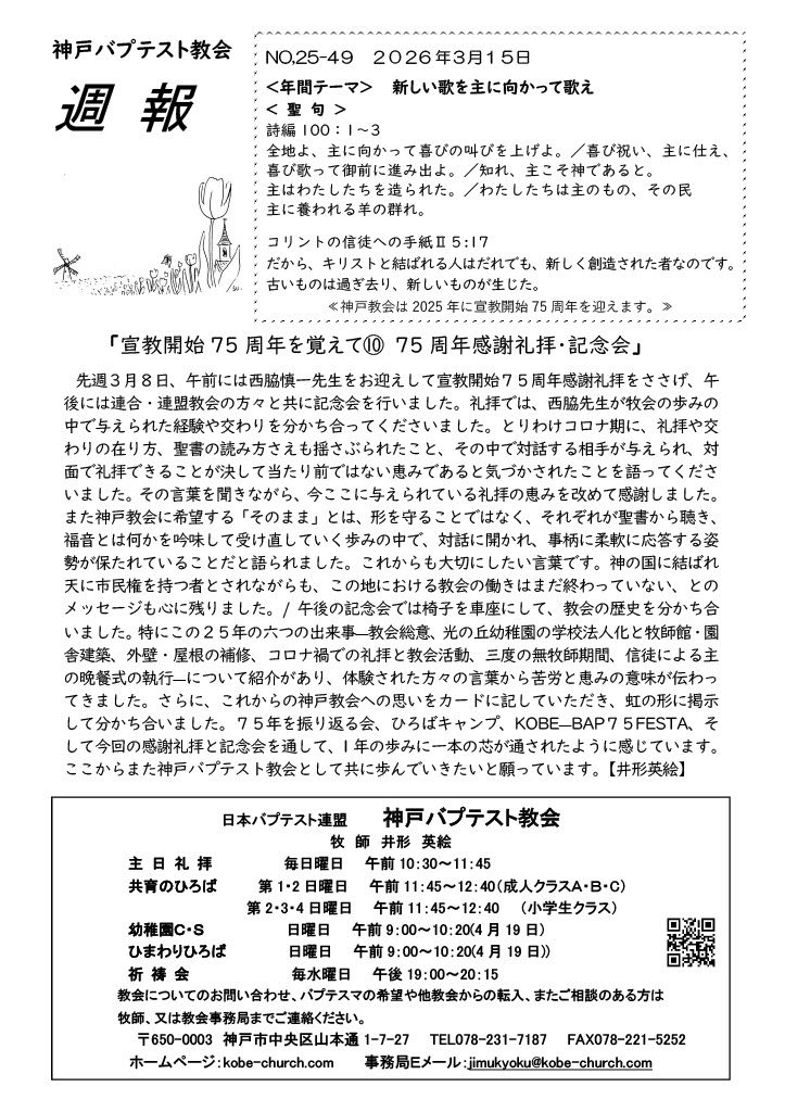 先週3月8日、午前には西脇慎一先生をお迎えして宣教開始75周年感謝礼拝をささげ、午