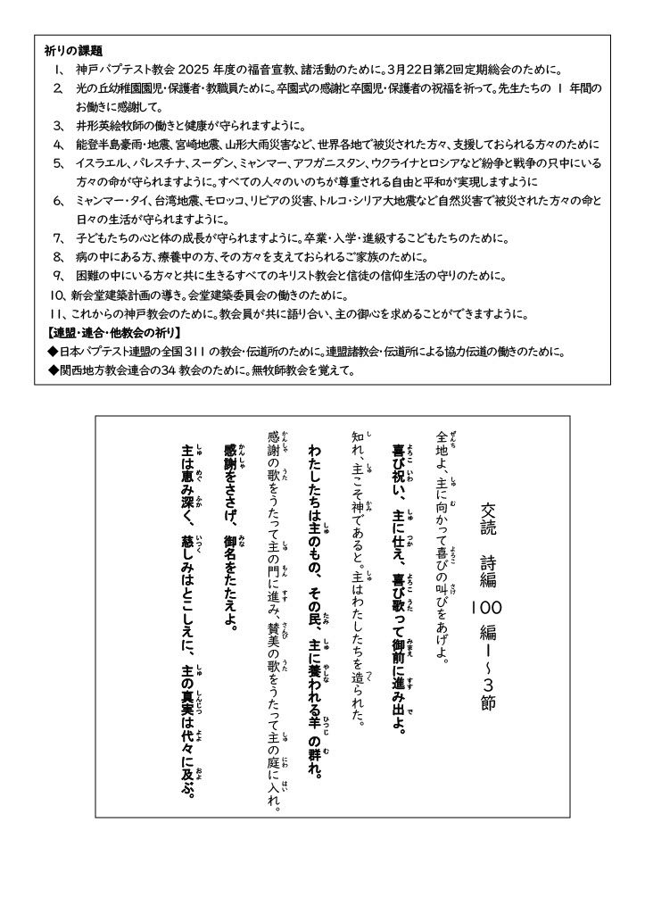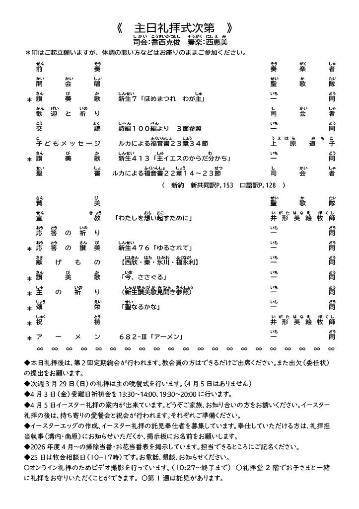 2026年3月22日(日) 主日礼拝 10:30am~11:45am