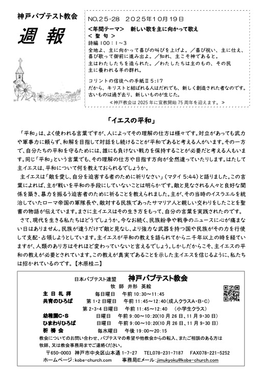「平和」は、よく使われる言葉ですが、人によってその理解の仕方は様々です。対立があっても武力や軍事力に頼らず、和解を目指して対話をし続けることが平和であると考える人がいます。その一方で、自分たちの平和を守るためには、誰にも負けない戦力を保持することが必要だと考える人もいます。同じ「平和」という言葉でも、その理解の仕方や目指す方向が全然違っていたりします。はたして主イエスは、平和について何を教えておられるでしょうか。主イエスは「敵を愛し、自分を迫害する者のために祈りなさい」(マタイ5:44)と語りました。この言葉によれば、主が戦いを平和の手段にしていないことは明らかです。敵と見なされる人々と良好な関係を築き、暴力を振るう迫害者のために祈ることを教えられました。主が、その当時のイスラエルを統治していたローマ帝国の軍隊長や、敵対する民族であったサマリア人と親しい交わりをしたことを聖書の物語が伝えています。まさに主イエスはその生き方をもって、自分の言葉を実践されたのです。さて、現代を生きる私たちはどうでしょうか。今なお続く、民族紛争や戦争のニュースに心が痛まない日はありません。民族が違うだけで敵と見なし、より強力な武器を持つ国や民族がその力を行使して支配・占領しようとしています。主イエスが平和の教えを語られてから二千年以上の時を経ていますが、人類のあり方はそれほど変わっていないと言えるでしょう。しかしだからこそ、主イエスの平和の教えが必要とされています。この教えが真実であることを示した主イエスを信じるように、私たちは招かれているのです。【木原桂二】