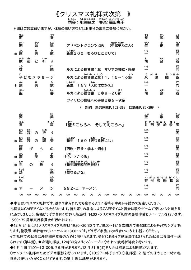 2025年12月21日(日) クリスマス礼拝 10:30am~11:45am